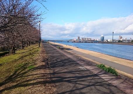 弁天大橋と舞鶴橋を回る2.4キロの河川敷周回コース。コース上に公衆トイレあり。暗くなると街灯も点灯し、安心して走ることができます